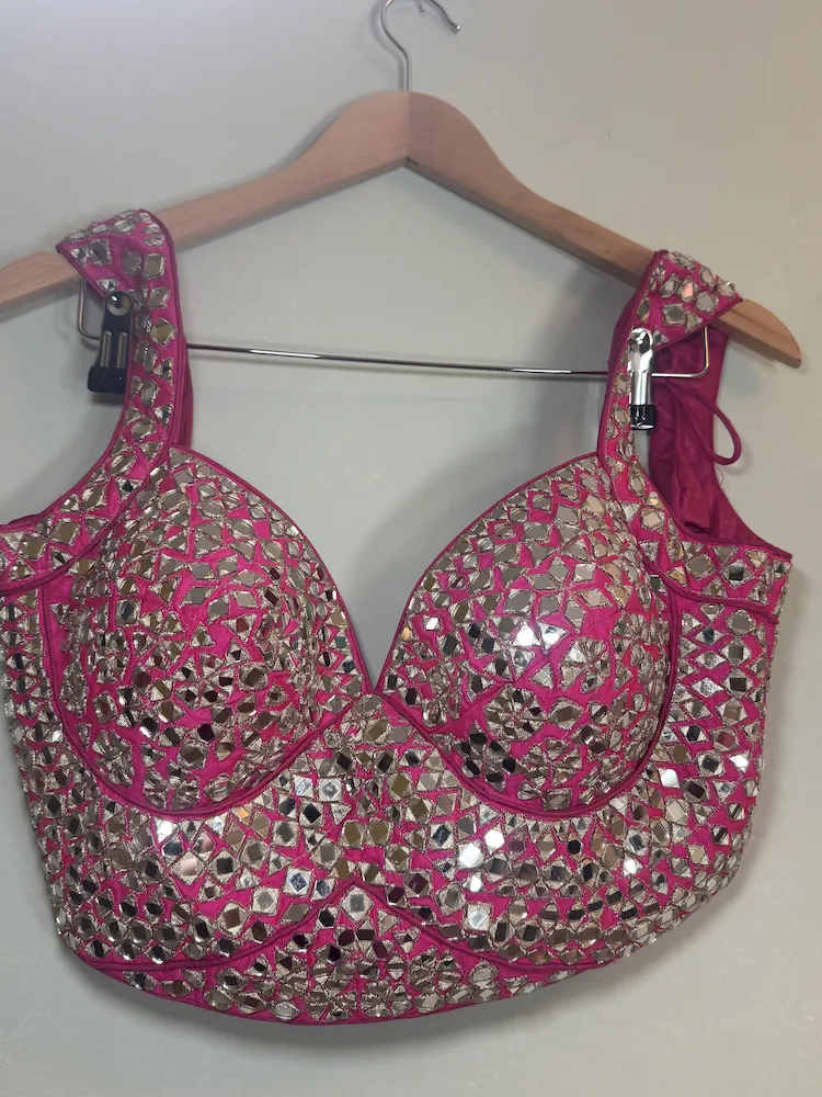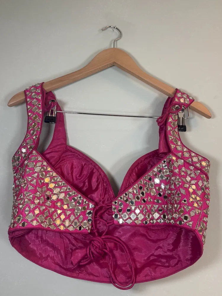 Illuminate your next celebration with a piece that is as unique as it is radiant. Our Handmade Pink Mirror-Work Blouse is a celebration of fine craftsmanship and modern femininity. Each mirror is painstakingly set by hand, ensuring a level of detail that only true luxury can provide.